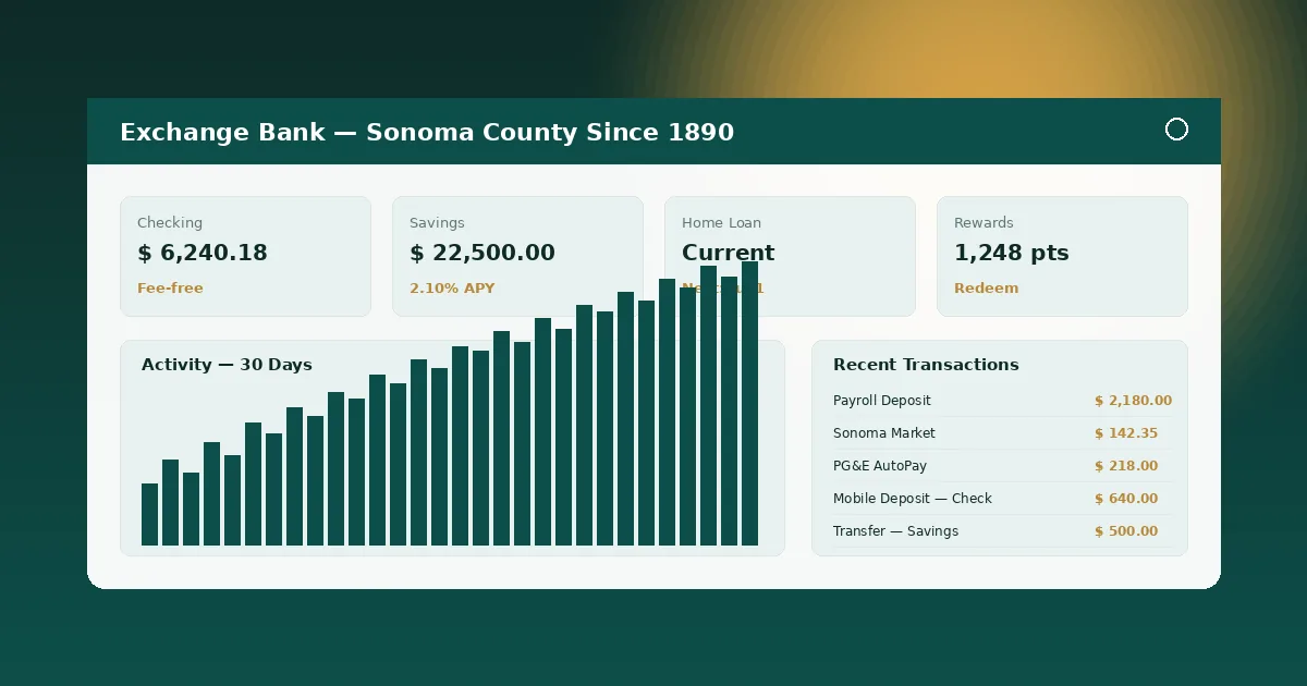 Exchange Bank digital banking dashboard showing checking, savings, home-loan status and recent Sonoma County transactions in teal and amber